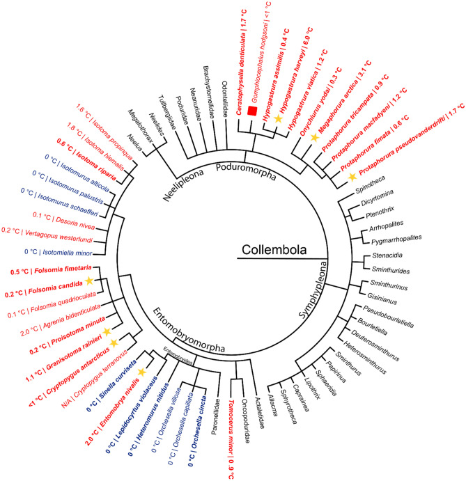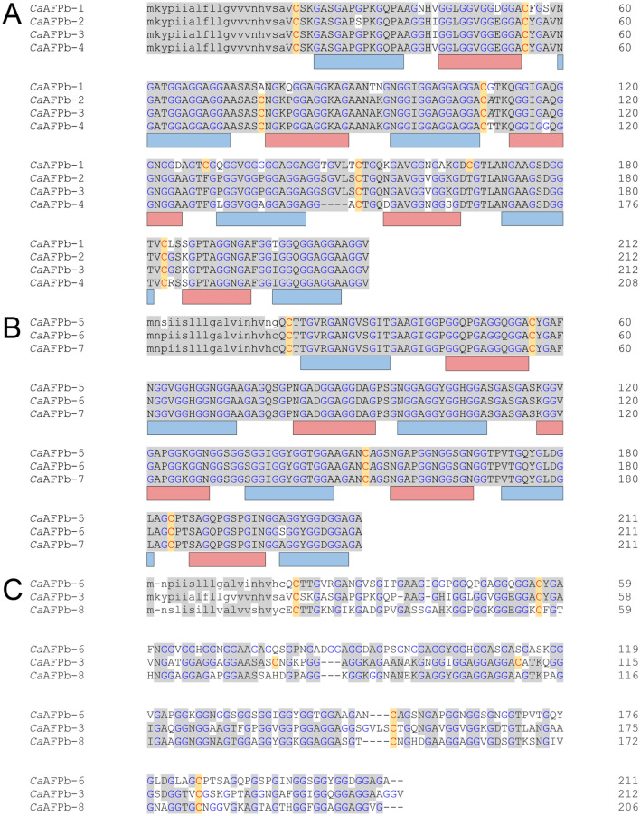 Antifreeze proteins (AFPs) bind to ice crystals to prevent organisms from freezing. A diversity of AFP folds has been found in fish and insects, including alpha helices, globular proteins, and several different beta solenoids. But the variety of AFPs in flightless arthropods, like Collembola, has not yet been adequately assessed. Here, antifreeze activity was shown to be present in 18 of the 22 species of Collembola from cold or temperate zones. Several methods were used to characterize these AFPs, including isolation by ice affinity purification, MALDI mass spectrometry, amino acid composition analysis, tandem mass spectrometry sequencing, transcriptome sequencing, and bioinformatic investigations of sequence databases. All of these AFPs had a high glycine content and were predicted to have the same polyproline type II helical bundle fold, a fold unique to Collembola. These Hexapods arose in the Ordovician Period with the two orders known to produce AFPs diverging around 400 million years ago during the Andean-Saharan Ice Age. Therefore, it is likely that the AFP arose then and persisted in many lineages through the following two ice ages and intervening warm periods, unlike the AFPs of fish which arose independently during the Cenozoic Ice Age beginning ~ 30 million years ago.
