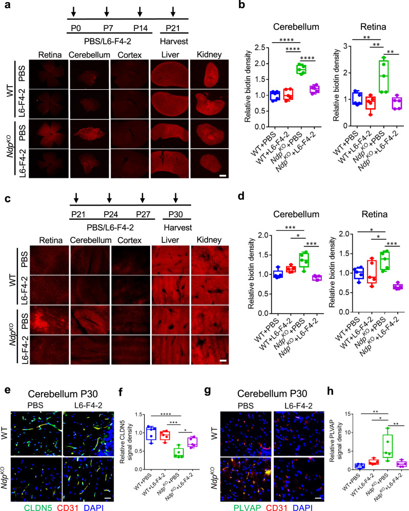 Derangements of the blood-brain barrier (BBB) or blood-retinal barrier (BRB) occur in disorders ranging from stroke, cancer, diabetic retinopathy, and Alzheimer's disease. The Norrin/FZD4/TSPAN12 pathway activates WNT/β-catenin signaling, which is essential for BBB and BRB function. However, systemic pharmacologic FZD4 stimulation is hindered by obligate palmitoylation and insolubility of native WNTs and suboptimal properties of the FZD4-selective ligand Norrin. Here, we develop L6-F4-2, a non-lipidated, FZD4-specific surrogate which significantly improves subpicomolar affinity versus native Norrin. In Norrin knockout (NdpKO) mice, L6-F4-2 not only potently reverses neonatal retinal angiogenesis deficits, but also restores BRB and BBB function. In adult C57Bl/6J mice, post-stroke systemic delivery of L6-F4-2 strongly reduces BBB permeability, infarction, and edema, while improving neurologic score and capillary pericyte coverage. Our findings reveal systemic efficacy of a bioengineered FZD4-selective WNT surrogate during ischemic BBB dysfunction, with potential applicability to adult CNS disorders characterized by an aberrant blood-brain barrier.