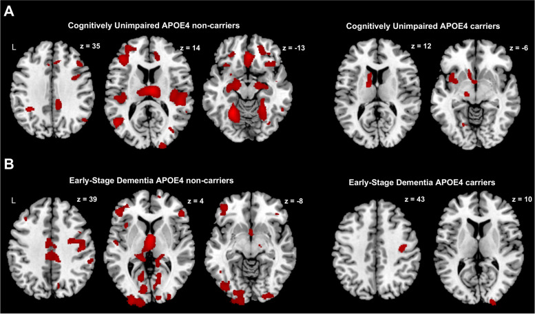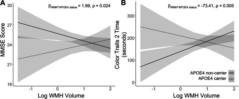 Results: Independent of APOE4 status, higher white matter hyperintensity load was associated with greater grey matter atrophy across frontal, parietal, temporal, and occipital lobes in cognitively unimpaired and early-stage dementia subjects. However, interaction analyses and independent sample analyses revealed that APOE4 non-carriers demonstrated greater white matter hyperintensity-associated grey matter atrophy compared to APOE4 carriers in both cognitively unimpaired and early-stage dementia groups. Additional confirmatory analyses among APOE4 non-carriers demonstrated that white matter hyperintensities resulted in widespread grey matter loss. Analyses of cognitive function demonstrated that higher white matter hyperintensity load was associated with worse global (Mini-Mental State Examination, Montreal Cognitive Assessment) and executive function (Color Trails 2) in APOE4 non-carriers compared to APOE4 carriers in early-stage dementia but not cognitively unimpaired participants.