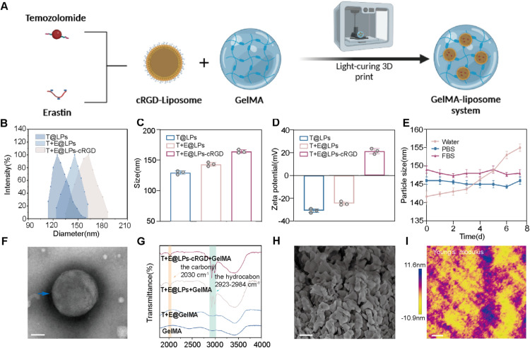 Glioblastoma is acknowledged as the most aggressive cerebral tumor in adults. However, the efficacy of current standard therapy is seriously undermined by drug resistance and suppressive immune microenvironment. Ferroptosis is a recently discovered form of iron-dependent cell death that may have excellent prospect as chemosensitizer. The utilization of ferropotosis inducer Erastin could significantly mediate chemotherapy sensitization of Temozolomide and exert anti-tumor effects in glioblastoma. In this study, a combination of hydrogel-liposome nanoplatform encapsulated with Temozolomide and ferroptosis inducer Erastin was constructed. The αvβ3 integrin-binding peptide cyclic RGD was utilized to modify codelivery system to achieve glioblastoma targeting strategy. As biocompatible drug reservoirs, cross-linked GelMA (gelatin methacrylamide) hydrogel and cRGD-coated liposome realized the sustained release of internal contents. In the modified intracranial tumor resection model, GelMA-liposome system achieved slow release of Temozolomide and Erastin in situ for more than 14 d. The results indicated that nanoplatform (T+E@LPs-cRGD+GelMA) improved glioblastoma sensitivity to chemotherapeutic temozolomide and exerted satisfactory anti-tumor effects. It was demonstrated that the induction of ferroptosis could be utilized as a therapeutic strategy to overcome drug resistance. Furthermore, transcriptome sequencing was conducted to reveal the underlying mechanism that the nanoplatform (T+E@LPs-cRGD+GelMA) implicated in. It is suggested that GelMA-liposome system participated in the immune response and immunomodulation of glioblastoma via interferon/PD-L1 pathway. Collectively, this study proposed a potential combinatory therapeutic strategy for glioblastoma treatment.