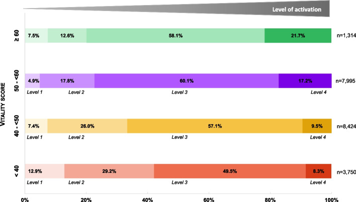 Results: A total of 24,295 participants were enrolled in the main analysis. Being a female, younger, having a lower income and being obese or having sleep and mental disorders was associated with an increased risk of impaired vitality. This was associated with a higher consumption of healthcare resources along with having a weak patient-physician relationship. Participants who were disengaged in the self-management of their health were 2.6 times more likely to have a low level of vitality. For participants in the lowest vitality group, odds of mobility problems increased by 3.4, impairment of usual activity by 5.8, increased of pain and discomfort by 5.6 and depression and anxiety by 10.3, compared with participants in the highest vitality group. Also, odds of presenteeism increased by 3.7, overall work impairment by 3.4 and daily activity losses by 7.1.