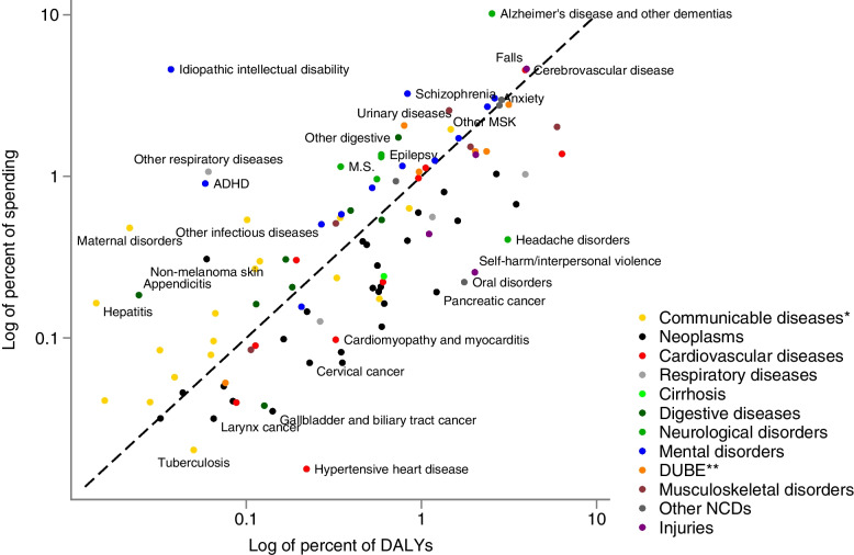 Methods: Government budgets, reimbursement databases, patient registries, and prescription databases were combined to estimate spending for 144 health conditions, 38 age and sex groups, and eight types of care (GPs; physiotherapists & chiropractors; specialized outpatient; day patient; inpatient; prescription drugs; home-based care; and nursing homes) totaling 174,157,766 encounters. Diagnoses were in accordance with the Global Burden of Disease study (GBD). The spending estimates were adjusted, by redistributing excess spending associated with each comorbidity. Disease-specific DALYs were gathered from GBD 2019.