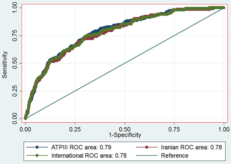 Both metabolic syndrome (MetS) and stroke are associated with increased risk of mortality. Here, we aimed to assess the prevalence of MetS among adults using three definitions (Adult Treatment Panel III (ATP-III), International Diabetes Federation (IDF) and IDF ethnic specific cut-off for Iranian criteria) and its association with stroke. We performed a cross-sectional study of a total of 9991 adult participants of Rafsanjan Cohort Study (RCS), as part of the Prospective epidemiological research studies in Iran (PERSIAN cohort study). The MetS prevalence was evaluated in participants according to the different criteria. Multivariate logistic regression analyses were conducted to assess the association between three definitions of MetS with stroke. We found that MetS was significantly associated with higher odds of stroke according to NCEP-ATP III (odds ratio (OR): 1.89, 95% confidence interval (CI) 1.30-2.74), international IDF (OR:1.66, 95% CI: 1.15-2.40) and Iranian IDF (OR:1.48, 95% CI: 1.04-2.09) after adjusted for variables confounders. Furthermore, after adjustment, in receiver operating characteristic (ROC) curve, the AUROC was 0.79 (95% CI = 0.75-0.82), 0.78(95% CI = 0.74-0.82) and 0.78(95% CI = 0.74-0.81) for presence of MetS according to NCEP-ATP III, international IDF and Iranian IDF, respectively. ROC analyses revealed that all of these three criteria for MetS are "moderately accurate" for the identification of increased stroke risk.In conclusion, our results showed that MetS was associated with increased odds of stroke. Our findings implicate the importance of early identification, treatment, and ultimately prevention of the metabolic syndrome.