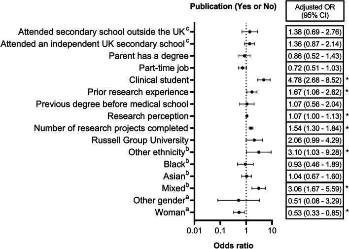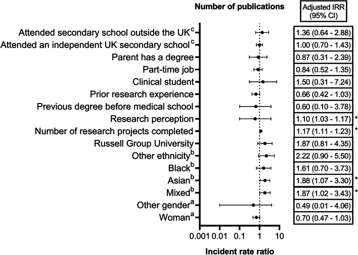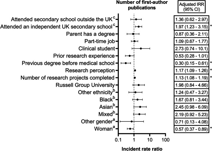 Results: There are 41 medical schools in the UK. We received 1573 responses from 36 UK medical schools. We failed to recruit student representatives from three newly formed medical schools, whilst two medical schools prohibited us from sending the survey to their students. Women had lower odds of having a publication (OR: 0.53, 95% CI: 0.33-0.85) and on average had fewer first-author publications than men (IRR: 0.57, 95% CI: 0.37-0.89). Compared to white students, mixed-ethnicity students had greater odds of having a publication (OR: 3.06, 95% CI: 1.67-5.59), an abstract presentation (OR: 2.12, 95% CI: 1.37-3.26), and on average had a greater number of publications (IRR: 1.87, 95% CI: 1.02-3.43). On average, students who attended independent UK secondary schools had a higher rate of first-author publications compared to those that attended state secondary schools (IRR: 1.97, 95% CI: 1.23-3.15).