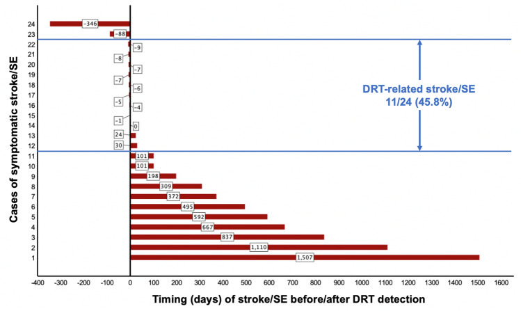 Aims: This study aimed to identify predisposing factors for stroke/SE in DRT patients. In addition, the temporal connection of stroke/SE to DRT diagnosis was analyzed.
