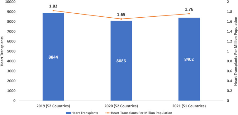 COVID-19 pandemic hampered operational efficiency of heart transplant (HT) programs worldwide. Little is known about the global and country-specific changes in HT volumes during the pandemic years 2020-2021. We aimed to describe the global and country-level impact of the COVID-19 pandemic on HT volumes in 2020-2021. This is a cross-sectional study of the Global Observatory on Donation and Transplantation, including the years 2019-2021. Among 60 countries that reported HT data in the years 2019-2020, we analyzed 52 countries with ≥1 transplant during each year. Overall, the number of HTs decreased during 2020 by 9.3% (1.82 to 1.65 PMP). While 75% (n = 39/52) of countries experienced a decrease in HT volumes in 2020, volumes were maintained/increased in the remaining countries. Countries with maintained HT volumes had a higher organ donation rate in 2020 compared to those with decreased volumes (P = 0.03), the only significant predictor of change in HT volumes (P = 0.005). In 2021, a 6.6% recovery from the previous year's drop in global HT rate was noticed, reaching 1.76 HT PMP. Only 1 in 5 countries with reduced volumes in 2020 recovered their baseline volumes in 2021. Only 30.8% of countries with maintained volumes in 2020 had continued growth in HT volumes in 2021. The latter group encompassed the United States of America, the Netherlands, Poland, and Portugal. Further work should define underlying causes of this heterogeneity in HT volume during the pandemic. Identifying policies and practices that helped certain countries mitigate the effect of the pandemic on HT activities may help other countries during similar health crises in the future.