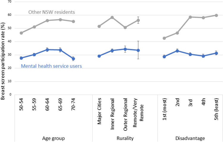 Results: Only 30.3% of mental health service users participated in breast screening, compared with 52.7% of other NSW women (crude incidence rate ratio 0.57, 95% CI 0.56-0.59). Standardisation for age, socioeconomic disadvantage or rural residence did not alter this screening gap. Around 7000 fewer women received screening than would be expected from comparable population rates. Screening gaps were largest in women over 60 and in socioeconomically advantaged areas. Women with severe or persistent mental illness had slightly higher screening rates than other mental health service users.