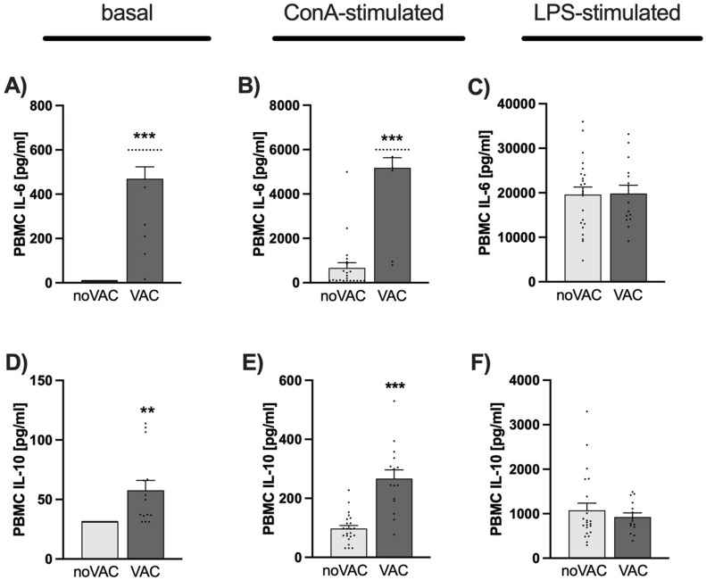 Ex vivo culturing of isolated PBMCs from individuals vaccinated with the coronavirus disease 2019 (COVID-19) vaccine BNT162b1 revealed a pronounced T cell response in the presence of the receptor binding domain (RBD) of the severe acute respiratory syndrome coronavirus 2 (SARS-CoV-2) spike protein. The latter was 10-fold more pronounced than the ex vivo response of PBMCs from the same individuals to other common pathogen T cell epitope pools, suggesting COVID-19 vaccination to induce RBD-specific T cell responses and not to facilitate T cell (re)activity in general. In the current study we investigated whether COVID-19 vaccination long-lastingly affects plasma interleukin (IL)-6 concentrations, complete blood counts, ex vivo IL-6 and IL-10 secretion of PBMCs cultured under basal conditions or in the presence of concanavalin (Con) A and lipopolysaccharide (LPS), salivary cortisol and α-amylase, mean arterial pressure (MAP), heart rate (HR) as well as mental and physical health status. The study was initially designed to investigate whether the presence vs. absence of own pets during urban upbringing has protective effects against psychosocial stress-induced immune activation during adulthood. However, as COVID-19 vaccines were approved while the study was ongoing and as, therefore, both vaccinated and non-vaccinated individuals have been recruited, we were able to stratify our data set with respect to the COVID-19 vaccination status and to assess the long-lasting effects of COVID-19 vaccination on physiological immunological, cardiovascular and psychosomatic health parameters. This data is presented in the current study. We show that isolated PBMCs from individuals vaccinated against COVID-19 show a ~ 600-fold increase in basal and a ~ 6000-fold increase in ConA-induced proinflammatory IL-6 secretion, and a ~ 2-fold increase in basal and ConA-induced antiinflammatory IL-10 secretion, both in comparison with non-vaccinated individuals. In contrast, LPS-induced ex vivo IL-6 and IL-10 secretions were not affected by vaccination status, as were plasma IL-6 concentrations, complete blood counts, salivary cortisol and α-amylase, cardiovascular measures and psychosomatic health. In summary, our findings are of relevance for many clinical studies ran before/during the pandemic, clearly indicating that consideration of participants' vaccination status is critical, at least when assessing ex vivo PBMC functionality.