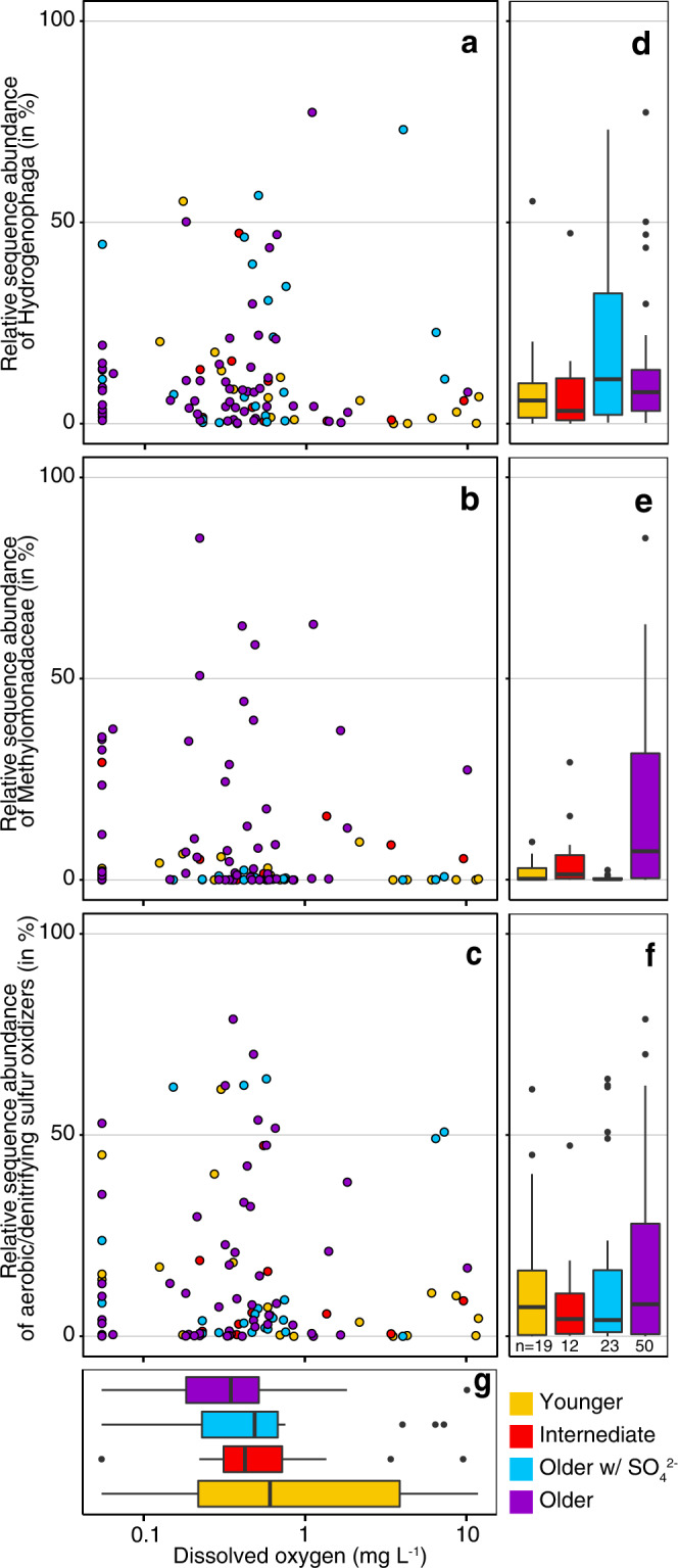 Around 50% of humankind relies on groundwater as a source of drinking water. Here we investigate the age, geochemistry, and microbiology of 138 groundwater samples from 95 monitoring wells (<250 m depth) located in 14 aquifers in Canada. The geochemistry and microbiology show consistent trends suggesting large-scale aerobic and anaerobic hydrogen, methane, nitrogen, and sulfur cycling carried out by diverse microbial communities. Older groundwaters, especially in aquifers with organic carbon-rich strata, contain on average more cells (up to 1.4 × 107 mL-1) than younger groundwaters, challenging current estimates of subsurface cell abundances. We observe substantial concentrations of dissolved oxygen (0.52 ± 0.12 mg L-1 [mean ± SE]; n = 57) in older groundwaters that seem to support aerobic metabolisms in subsurface ecosystems at an unprecedented scale. Metagenomics, oxygen isotope analyses and mixing models indicate that dark oxygen is produced in situ via microbial dismutation. We show that ancient groundwaters sustain productive communities and highlight an overlooked oxygen source in present and past subsurface ecosystems of Earth.