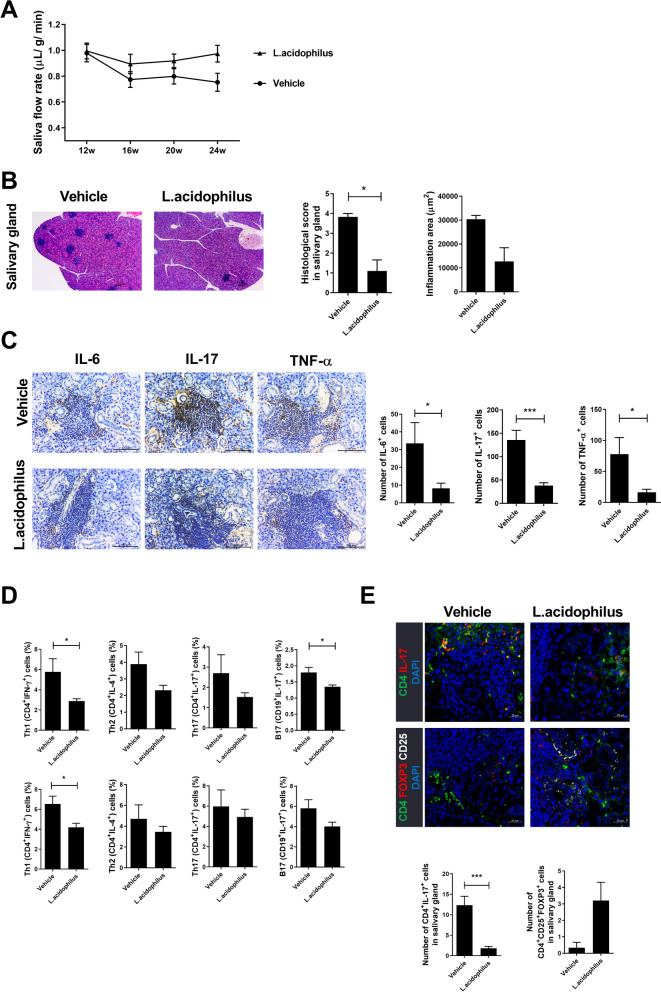 Background: Sjögren's syndrome (SS) is an autoimmune disease characterized by inflammation of the exocrine gland. An imbalance of gut microbiota has been linked to SS. However, the molecular mechanism is unclear. We investigated the effects of Lactobacillus acidophilus (L. acidophilus) and propionate on the development and progression of SS in mouse model.