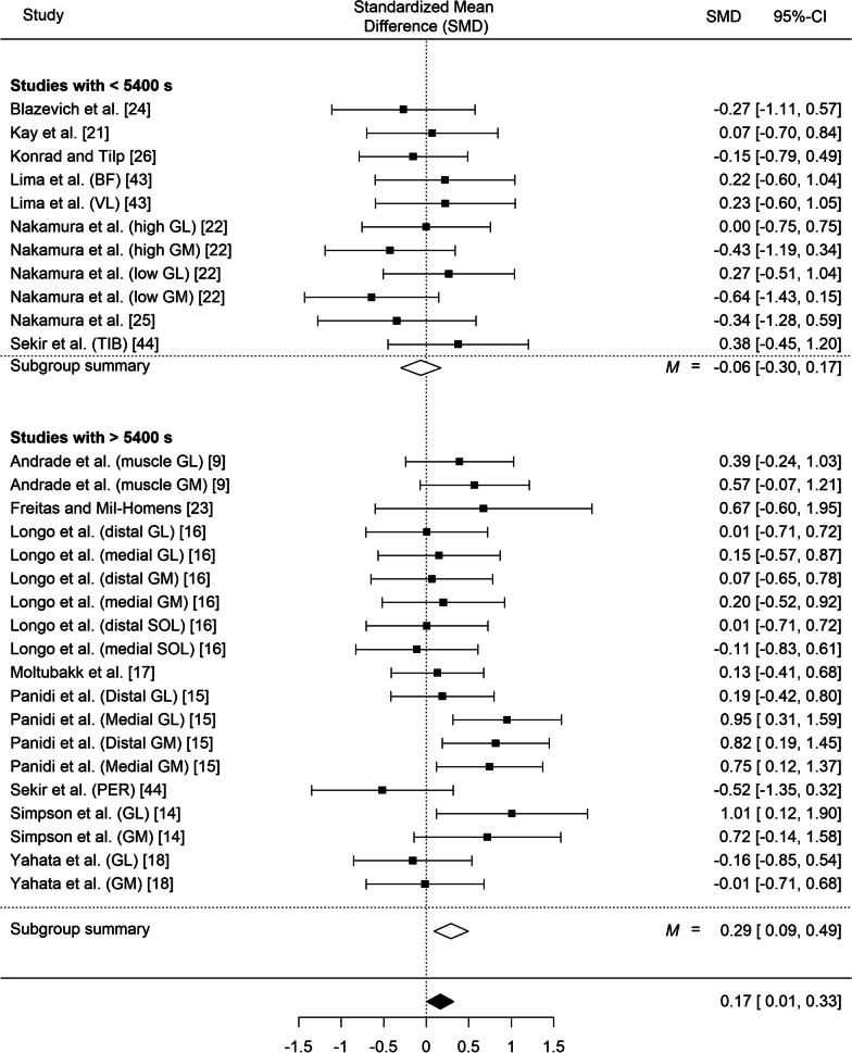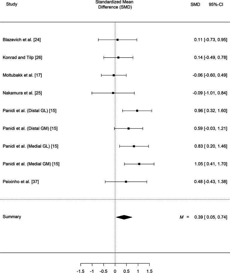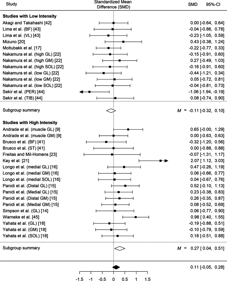 Results: From the 2946 records retrieved, 19 studies were included in the systematic review and meta-analysis (n = 467 participants). Risk of bias was low in 83.9% of all criteria. Confidence in cumulative evidence was high. Stretching training induces trivial increases in fascicle length at rest (SMD = 0.17; 95% CI 0.01-0.33; p = 0.042) and small increases in fascicle length during stretching (SMD = 0.39; 95% CI 0.05 to 0.74; p = 0.026). No increases were observed in fascicle angle or muscle thickness (p = 0.30 and p = 0.18, respectively). Subgroup analyses showed that fascicle length increased when high stretching volumes were used (p < 0.004), while no changes were found for low stretching volumes (p = 0.60; subgroup difference: p = 0.025). High stretching intensities induced fascicle length increases (p < 0.006), while low stretching intensities did not have an effect (p = 0.72; subgroup difference: p = 0.042). Also, high intensity stretching resulted in increased muscle thickness (p = 0.021). Meta-regression analyses showed that longitudinal fascicle growth was positively associated with stretching volume (p < 0.02) and intensity (p < 0.04).