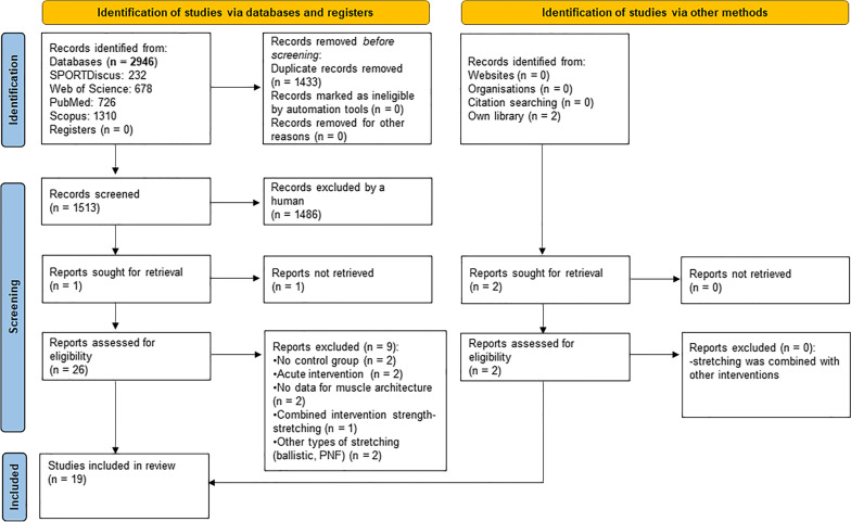 Objective: To examine the effect of static stretching training on muscle architecture (i.e., fascicle length and fascicle angle, muscle thickness and cross-sectional area) in healthy participants.