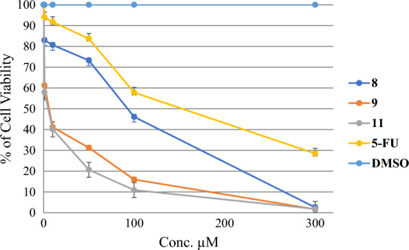 Results: A series of carbazole derivatives were synthesized and characterized in the current study. Compounds 10 and 11 were found to have a stronger antiproliferative effect than compounds 2-5 against HepG2, HeLa, and MCF7 cancer cell lines with IC50 values of 7.68, 10.09, and 6.44 µM, respectively. Moreover, compound 9 showed potent antiproliferative activity against HeLa cancer cell lines with an IC50 value of 7.59 µM. However, except for compound 5, all of the synthesized compounds showed moderate antiproliferative activities against CaCo-2 with IC50 values in the range of 43.7-187.23 µM. All of these values were compared with the positive control anticancer drug 5-Fluorouracil (5-FU). In addition, compound 9 showed the most potent anti-fibrotic compound, and the cellular viability of LX-2 was found 57.96% at 1 µM concentration in comparison with the positive control 5-FU. Moreover, 4 and 9 compounds showed potent antioxidant activities with IC50 values of 1.05 ± 0.77 and 5.15 ± 1.01 µM, respectively.