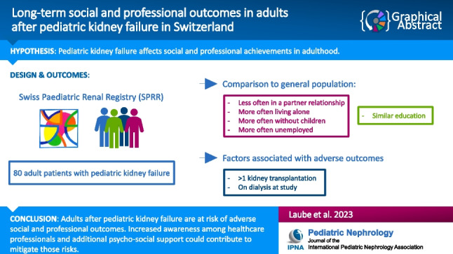 Conclusions: Adults after pediatric kidney failure are at risk to experience adverse social and professional outcomes. Increased awareness among healthcare professionals and additional psycho-social support could contribute to mitigate those risks. A higher resolution version of the Graphical abstract is available as Supplementary information.