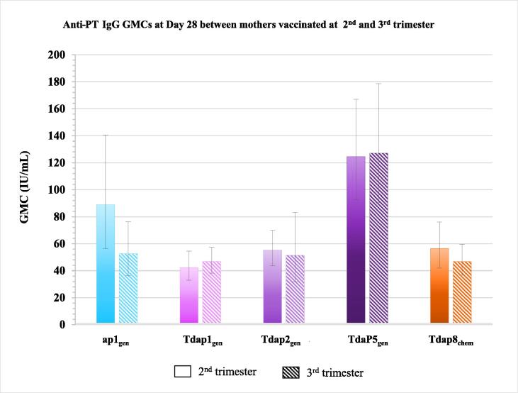 Introduction: Despite a decrease in infections caused by Bordetella pertussis due to COVID-19 pandemic, booster vaccination of pregnant women is still recommended to protect newborns. Highly immunogenic vaccines containing genetically inactivated pertussis toxin (PTgen) and filamentous hemagglutinin (FHA) may generate comparable anti-PT antibody concentrations, even at lower doses, to chemically inactivated acellular pertussis vaccines (Tdapchem) shown effective for maternal immunization.