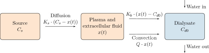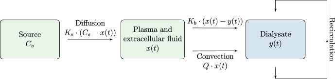 Chronic kidney diseases imply an ongoing need to remove toxins, with hemodialysis as the preferred treatment modality. We derive analytical expressions for phosphate clearance during dialysis, the single pass (SP) model corresponding to a standard clinical hemodialysis and the multi pass (MP) model, where dialysate is recycled and therefore makes a smaller clinical setting possible such as a transportable dialysis suitcase. For both cases we show that the convective contribution to the dialysate is negligible for the phosphate kinetics and derive simpler expressions. The SP and MP models are calibrated to clinical data of ten patients showing consistency between the models and provide estimates of the kinetic parameters. Immediately after dialysis a rebound effect is observed. We derive a simple formula describing this effect which is valid both posterior to SP or MP dialysis. The analytical formulas provide explanations to observations of previous clinical studies.