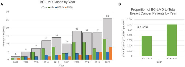 Results: 128 cases of BC-LMD were identified. The proportion of BC-LMD to total BC patients was higher between 2016-2020 when compared to 2011-2015. Patients with HR + or HER2 + BC experienced longer times between CNS metastasis and LMD than patients with triple-negative breast cancer (TNBC). Systemic therapy and whole-brain radiation therapy (WBRT) prolonged progression to LMD in all patients. Hormone therapy in patients with HR + BC delayed BC-CNS metastasis to LMD progression. Lapatinib delayed progression to LMD in patients with HER2 + BC. Patients with TNBC-LMD had shorter OS compared to those with HR + and HER2 + BC-LMD. Systemic therapy, intrathecal (IT) therapy, and WBRT prolonged survival for all patients. Lapatinib and trastuzumab improved OS in patients with HER2 + BC-LMD.