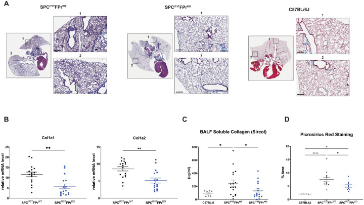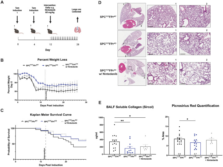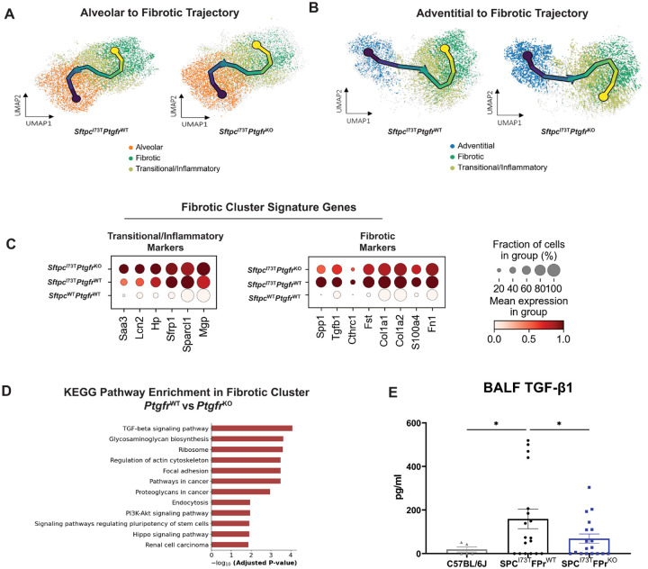 Idiopathic Pulmonary Fibrosis (IPF) is a chronic parenchymal lung disease characterized by repetitive alveolar cell injury, myofibroblast proliferation, and excessive extracellular matrix deposition for which unmet need persists for effective therapeutics. The bioactive eicosanoid, prostaglandin F2α, and its cognate receptor FPr (Ptfgr) are implicated as a TGFβ1 independent signaling hub for IPF. To assess this, we leveraged our published murine PF model (I ER - Sftpc I73T ) expressing a disease-associated missense mutation in the surfactant protein C (Sftpc) gene. Tamoxifen treated I ER -Sftpc I73T mice develop an early multiphasic alveolitis and transition to spontaneous fibrotic remodeling by 28 days. I ER -Sftpc I73T mice crossed to a Ptgfr null (FPr-/-) line showed attenuated weight loss and gene dosage dependent rescue of mortality compared to FPr+/+ cohorts. I ER -Sftpc I73T /FPr-/- mice also showed reductions in multiple fibrotic endpoints for which administration of nintedanib was not additive. Single cell RNA sequencing, pseudotime analysis, and in vitro assays demonstrated Ptgfr expression predominantly within adventitial fibroblasts which were reprogrammed to an "inflammatory/transitional" cell state in a PGF2α/FPr dependent manner. Collectively, the findings provide evidence for a role for PGF2α signaling in IPF, mechanistically identify a susceptible fibroblast subpopulation, and establish a benchmark effect size for disruption of this pathway in mitigating fibrotic lung remodeling.