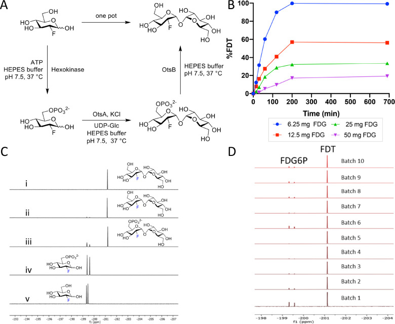 Tuberculosis remains a large global disease burden for which treatment regimens are protracted and monitoring of disease activity difficult. Existing detection methods rely almost exclusively on bacterial culture from sputum which limits sampling to organisms on the pulmonary surface. Advances in monitoring tuberculous lesions have utilized the common glucoside [18F]FDG, yet lack specificity to the causative pathogen Mycobacterium tuberculosis (Mtb) and so do not directly correlate with pathogen viability. Here we show that a close mimic that is also positron-emitting of the non-mammalian Mtb disaccharide trehalose - 2-[18F]fluoro-2-deoxytrehalose ([18F]FDT) - can act as a mechanism-based enzyme reporter in vivo. Use of [18F]FDT in the imaging of Mtb in diverse models of disease, including non-human primates, successfully co-opts Mtb-specific processing of trehalose to allow the specific imaging of TB-associated lesions and to monitor the effects of treatment. A pyrogen-free, direct enzyme-catalyzed process for its radiochemical synthesis allows the ready production of [18F]FDT from the most globally-abundant organic 18F-containing molecule, [18F]FDG. The full, pre-clinical validation of both production method and [18F]FDT now creates a new, bacterium-specific, clinical diagnostic candidate. We anticipate that this distributable technology to generate clinical-grade [18F]FDT directly from the widely-available clinical reagent [18F]FDG, without need for either bespoke radioisotope generation or specialist chemical methods and/or facilities, could now usher in global, democratized access to a TB-specific PET tracer.