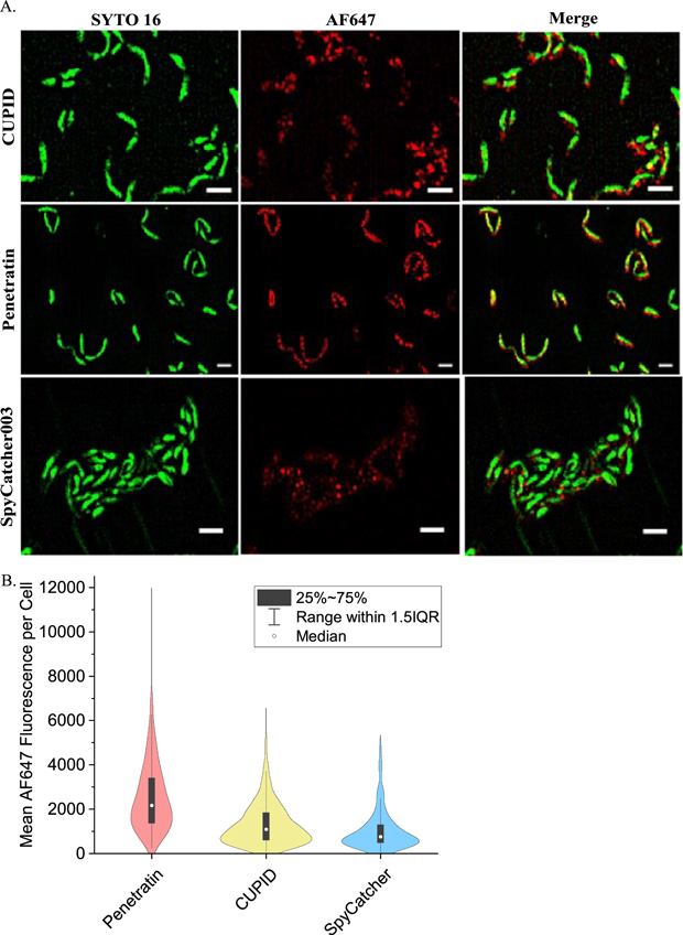 In vivoimaging of protein complexes is a powerful method for understanding the underlying biological function of these key biomolecules. Though the engineering of small, high affinity nanobodies have become more prevalent, the off-rates of these tags may result in incomplete or partial labeling of proteins in live cells. The SpyCatcher003 and SpyTag split protein system allow for irreversible, covalent binding to a short target peptide unlike nanobody-affinity based probes. However, delivering these tags into a cell without disrupting its normal function is a key challenge. Cell penetrating peptides (CPPs) are short peptide sequences that facilitate the transduction of otherwise membrane-impermeable 'cargo' , such as proteins, into cells. Here we report on our efforts to engineer and characterize CPP-SpyCatcher003 fusions as modular imaging probes. We selected three CPPs, CUPID, Pentratin, and pVEC, to engineer fusion protein probes for superresolution microscopy, with the aim to eliminate prior permeabilization treatments that could introduce imaging artifacts. We find that fusing the CPP sequences to SpyCatcher003 resulted in dimer and multimer formation as determined by size exclusion chromatography, dynamic light scattering, and SDS resistant dimers on SDS-PAGE gels. By isolating and labeling the monomeric forms of the engineered protein, we show these constructs retained their ability to bind SpyTag and all three CPP sequences remain membrane active, as assessed by CD spectroscopy in the presence of SDS detergent. Using fluorescence and super resolution Lattice structured illumination microscopy (Lattice SIM) imaging we show that the CPPs did not enhance uptake of SpyCatcher byE. coli,however withCaulobacter crescentuscells, we show that Penetratin, and to a lesser degree CUPID, does enhance uptake. Our results demonstrate the ability of the CPP-SpyCatcher003 to label targets within living cells, providing the groundwork for using split protein systems for targetedin vivoimaging.