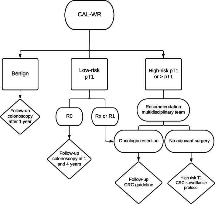 Discussion: CAL-WR is a full-thickness local resection technique that could also be effective in removing pT1 colon cancer. With the lack of current endoscopic local resection techniques for > 15 mm pT1 CCs with deep submucosal invasion, CAL-WR could fill the gap between endoscopy and major oncologic surgery. The present study is the first to provide insight in the long-term oncological outcomes of CAL-WR.
