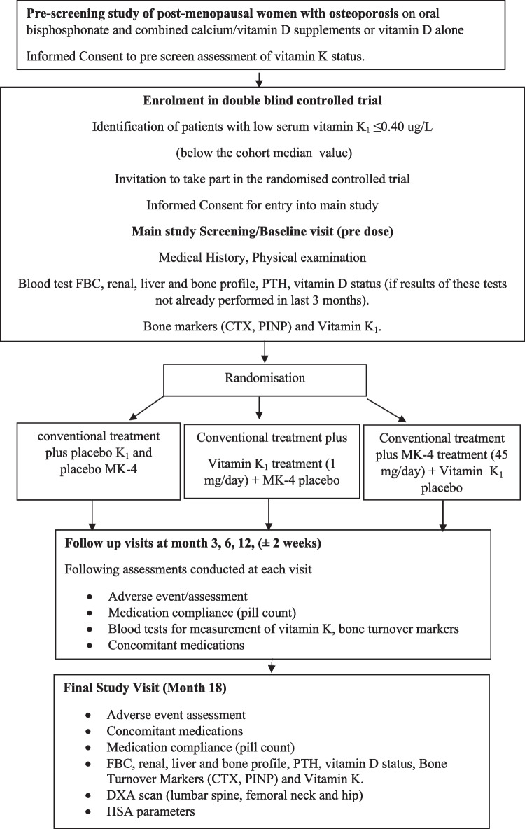 Purpose: Some clinical studies have suggested that vitamin K prevents bone loss and may improve fracture risk. The aim was to assess whether vitamin K supplementation has an additive effect on bone mineral density (BMD), hip geometry and bone turnover markers (BTMs) in post-menopausal women with osteoporosis (PMO) and sub-optimum vitamin K status receiving bisphosphonate, calcium and/or vitamin D treatment.