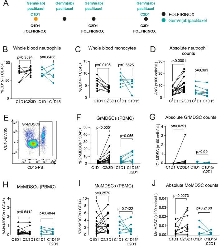 Methods: Serial blood was collected from patients with pancreatic ductal adenocarcinoma newly starting on FOLFIRINOX or gemcitabine/n(ab)paclitaxel combination chemotherapy regimens. Neutrophil and monocyte frequencies were determined by flow cytometry from whole blood and peripheral blood mononuclear cell fractions. Serum cytokines were evaluated pretreatment and on-treatment. Patient serum was used in vitro to differentiate healthy donor monocytes to MDSCs as measured by downregulation of major histocompatibility complex II (HLA-DR) and the ability to suppress T-cell proliferation in vitro. C57BL/6 female mice with pancreatic tumors were treated with FOLFIRINOX with or without recombinant G-CSF to directly assess the role of G-CSF on induction of immunosuppressive neutrophils.