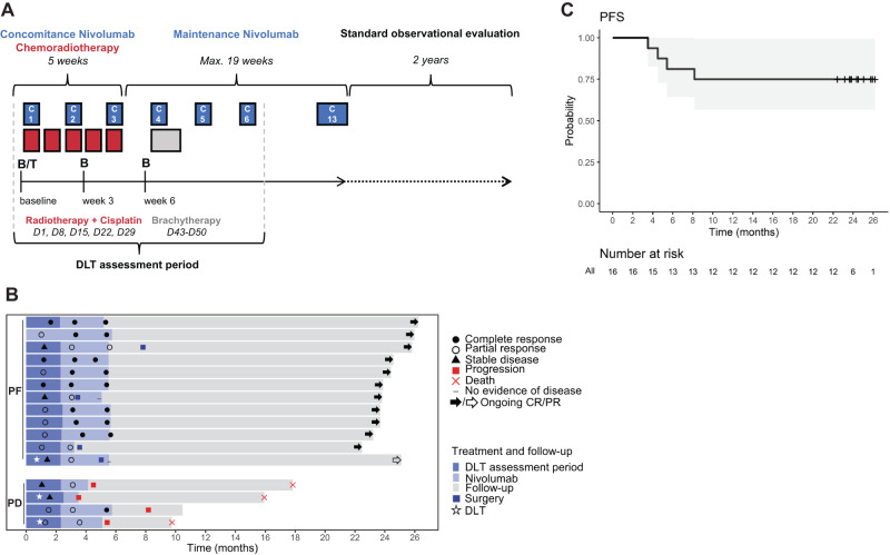 Concurrent chemoradiotherapy (CRT) with blockade of the PD-1 pathway may enhance immune-mediated tumor control through increased phagocytosis, cell death, and antigen presentation. The NiCOL phase 1 trial (NCT03298893) is designed to determine the safety/tolerance profile and the recommended phase-II dose of nivolumab with and following concurrent CRT in 16 women with locally advanced cervical cancer. Secondary endpoints include objective response rate (ORR), progression free survival (PFS), disease free survival, and immune correlates of response. Three patients experience grade 3 dose-limiting toxicities. The pre-specified endpoints are met, and overall response rate is 93.8% [95%CI: 69.8-99.8%] with a 2-year PFS of 75% [95% CI: 56.5-99.5%]. Compared to patients with progressive disease (PD), progression-free (PF) subjects show a brisker stromal immune infiltrate, higher proximity of tumor-infiltrating CD3+ T cells to PD-L1+ tumor cells and of FOXP3+ T cells to proliferating CD11c+ myeloid cells. PF show higher baseline levels of PD-1 and ICOS-L on tumor-infiltrating EMRA CD4+ T cells and tumor-associated macrophages, respectively; PD instead, display enhanced PD-L1 expression on TAMs, higher peripheral frequencies of proliferating Tregs at baseline and higher PD-1 levels at week 6 post-treatment initiation on CD4 and CD8 T cell subsets. Concomitant nivolumab plus definitive CRT is safe and associated with encouraging PFS rates. Further validation in the subset of locally advanced cervical cancer displaying pre-existing, adaptive immune activation is warranted.