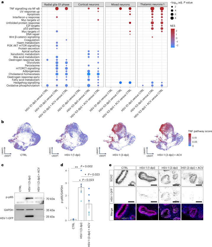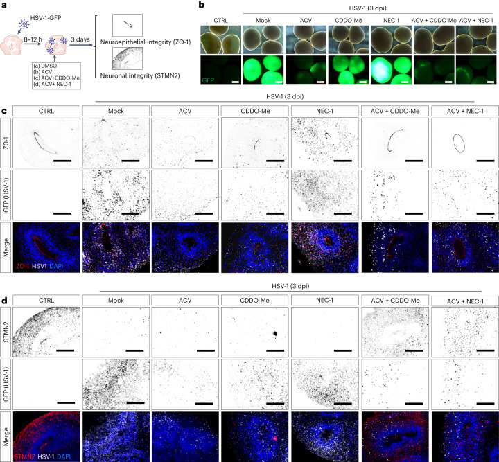 Herpes simplex encephalitis is a life-threatening disease of the central nervous system caused by herpes simplex viruses (HSVs). Following standard of care with antiviral acyclovir treatment, most patients still experience various neurological sequelae. Here we characterize HSV-1 infection of human brain organoids by combining single-cell RNA sequencing, electrophysiology and immunostaining. We observed strong perturbations of tissue integrity, neuronal function and cellular transcriptomes. Under acyclovir treatment viral replication was stopped, but did not prevent HSV-1-driven defects such as damage of neuronal processes and neuroepithelium. Unbiased analysis of pathways deregulated upon infection revealed tumour necrosis factor activation as a potential causal factor. Combination of anti-inflammatory drugs such as necrostatin-1 or bardoxolone methyl with antiviral treatment prevented the damages caused by infection, indicating that tuning the inflammatory response in acute infection may improve current therapeutic strategies.