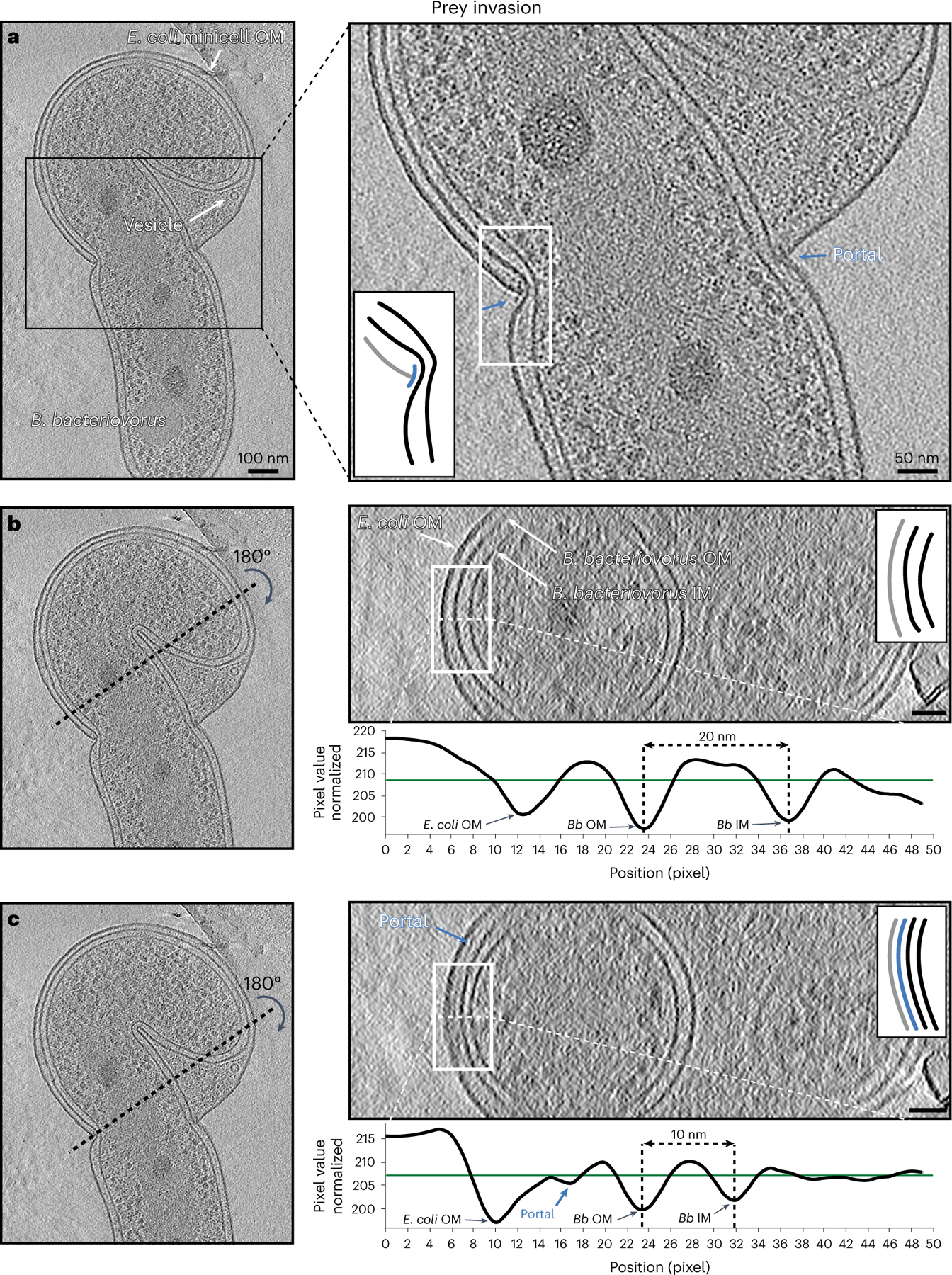 Bdellovibrio bacteriovorus is a microbial predator that offers promise as a living antibiotic for its ability to kill Gram-negative bacteria, including human pathogens. Even after six decades of study, fundamental details of its predation cycle remain mysterious. Here we used cryo-electron tomography to comprehensively image the lifecycle of B. bacteriovorus at nanometre-scale resolution. With high-resolution images of predation in a native (hydrated, unstained) state, we discover several surprising features of the process, including macromolecular complexes involved in prey attachment/invasion and a flexible portal structure lining a hole in the prey peptidoglycan that tightly seals the prey outer membrane around the predator during entry. Unexpectedly, we find that B. bacteriovorus does not shed its flagellum during invasion, but rather resorbs it into its periplasm for degradation. Finally, following growth and division in the bdelloplast, we observe a transient and extensive ribosomal lattice on the condensed B. bacteriovorus nucleoid.