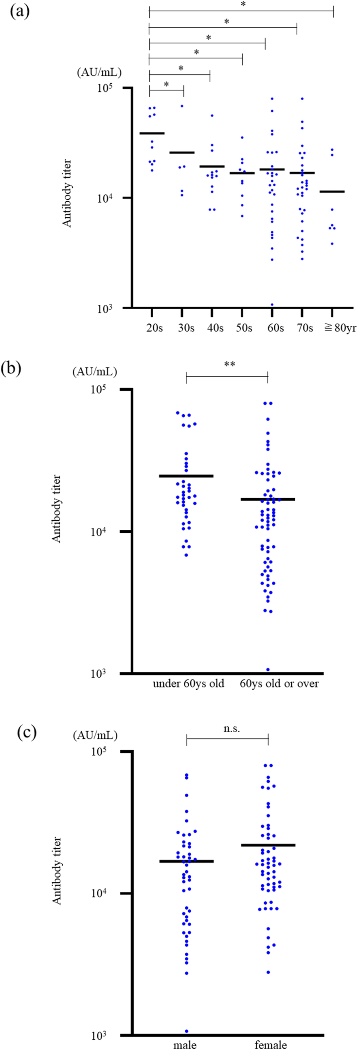 The antibody titers of volunteers, including elderly people, were investigated after the second dose of the BNT162b2 vaccine (Pfizer-BioNTech) as an mRNA vaccine against the coronavirus disease 2019 (COVID-19). Serum samples were collected from 105 volunteers (44 healthcare workers and 61 elderly people) 7-14 days after the second vaccine dose, and antibody titers were measured. The antibody titers of study participants in their 20s were significantly higher than those of other age groups. Furthermore, the antibody titers of participants aged <60 years were significantly higher than those of participants aged ≥60 years. Serum samples were repeatedly collected from 44 healthcare workers until after the third vaccine dose. Eight months after the second round of vaccination, the antibody titer levels decreased to the same level as that before the second vaccine dose. After the third booster vaccination, the antibody titer recovered to the same level as that after the second dose. Neutralizing activities were also investigated at four time points before and after the second vaccine dose. The antibody titers and neutralizing activity were positively correlated. Therefore, neutralizing activity can be predicted by measuring the antibody titer. In conclusion, the antibody titers in the elderly population were significantly lower than those in the younger population. Although the antibody titers increased following vaccination, their levels showed a decline after several months, returning to the same level as that after a single dose of mRNA vaccination. The antibody titer levels recovered after the third dose of vaccination, which had already been administered in Japan. Routine administration of vaccine should be considered in the future.