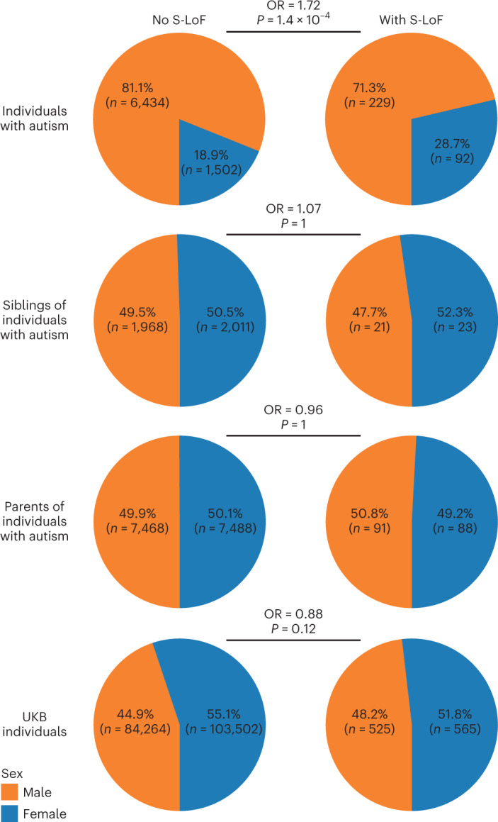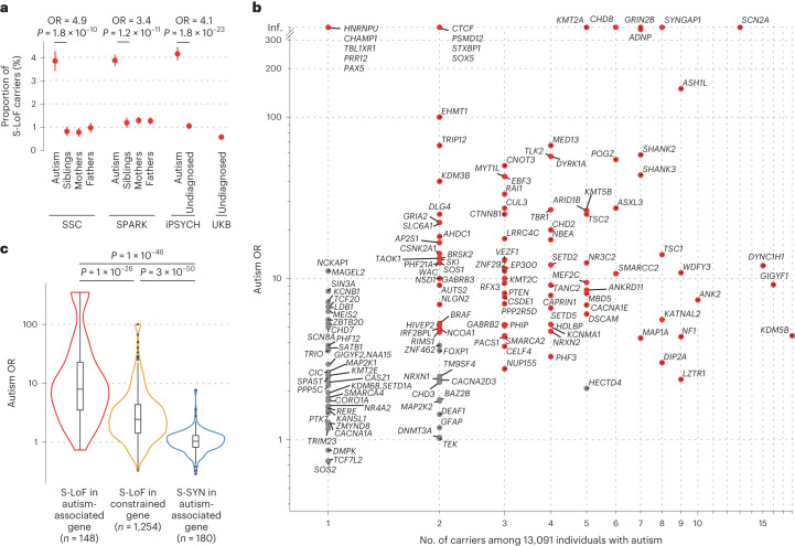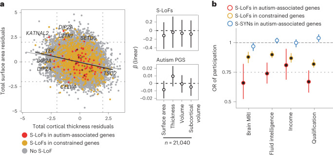 While over 100 genes have been associated with autism, little is known about the prevalence of variants affecting them in individuals without a diagnosis of autism. Nor do we fully appreciate the phenotypic diversity beyond the formal autism diagnosis. Based on data from more than 13,000 individuals with autism and 210,000 undiagnosed individuals, we estimated the odds ratios for autism associated to rare loss-of-function (LoF) variants in 185 genes associated with autism, alongside 2,492 genes displaying intolerance to LoF variants. In contrast to autism-centric approaches, we investigated the correlates of these variants in individuals without a diagnosis of autism. We show that these variants are associated with a small but significant decrease in fluid intelligence, qualification level and income and an increase in metrics related to material deprivation. These effects were larger for autism-associated genes than in other LoF-intolerant genes. Using brain imaging data from 21,040 individuals from the UK Biobank, we could not detect significant differences in the overall brain anatomy between LoF carriers and non-carriers. Our results highlight the importance of studying the effect of the genetic variants beyond categorical diagnosis and the need for more research to understand the association between these variants and sociodemographic factors, to best support individuals carrying these variants.