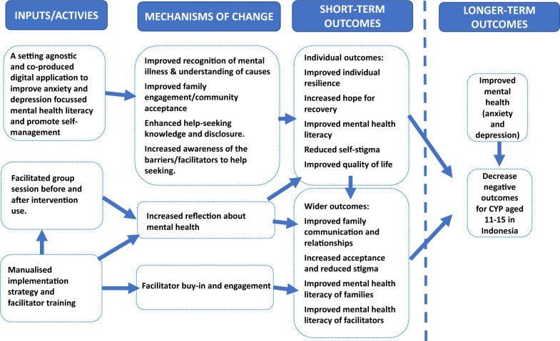 Methods: Mixed methods, multi-site case studies based on a theory of change. Pre-and post-assessments of a range of outcomes and qualitative interviews/focus groups with children and young people (CYP), parents and facilitators. The intervention was implemented in 8 health, school and community sites across Java, Indonesia (Megelang, Jakarta and Bogor). Quantitative data designed to understand the impact of and feasibility of evaluating the intervention collected from 78 CYP who used the intervention were analysed descriptively. Qualitative data from interviews and focus groups collected from 56 CYP, 49 parents/caregivers and 18 facilitators were analysed using framework analysis.