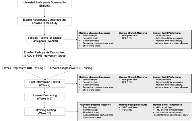 Methods: A permuted block randomized (1:1 allocation) intervention trial will be conducted involving young, physically-active men and women. A target sample size of 32 will be recruited and enrolled participants will undergo baseline testing involving extended-field-of-view ultrasound imaging and shear wave elastography of the biceps femoris long head muscle, maximal hamstrings strength testing in both the RDL and NHE, and on-field sprint performance and biomechanics. Participants will complete the 6-week training intervention using either the RDL or NHE, according to group allocation. Baseline testing will be repeated at the end of the 6-week intervention followed by 2 weeks of detraining and a final testing session. The primary outcome will be regional changes in fascicle length with secondary outcomes including pennation angle, muscle cross sectional area, hamstring strength, and maximal sprint performance and biomechanics. An exploratory aim will determine changes in shear wave velocity.
