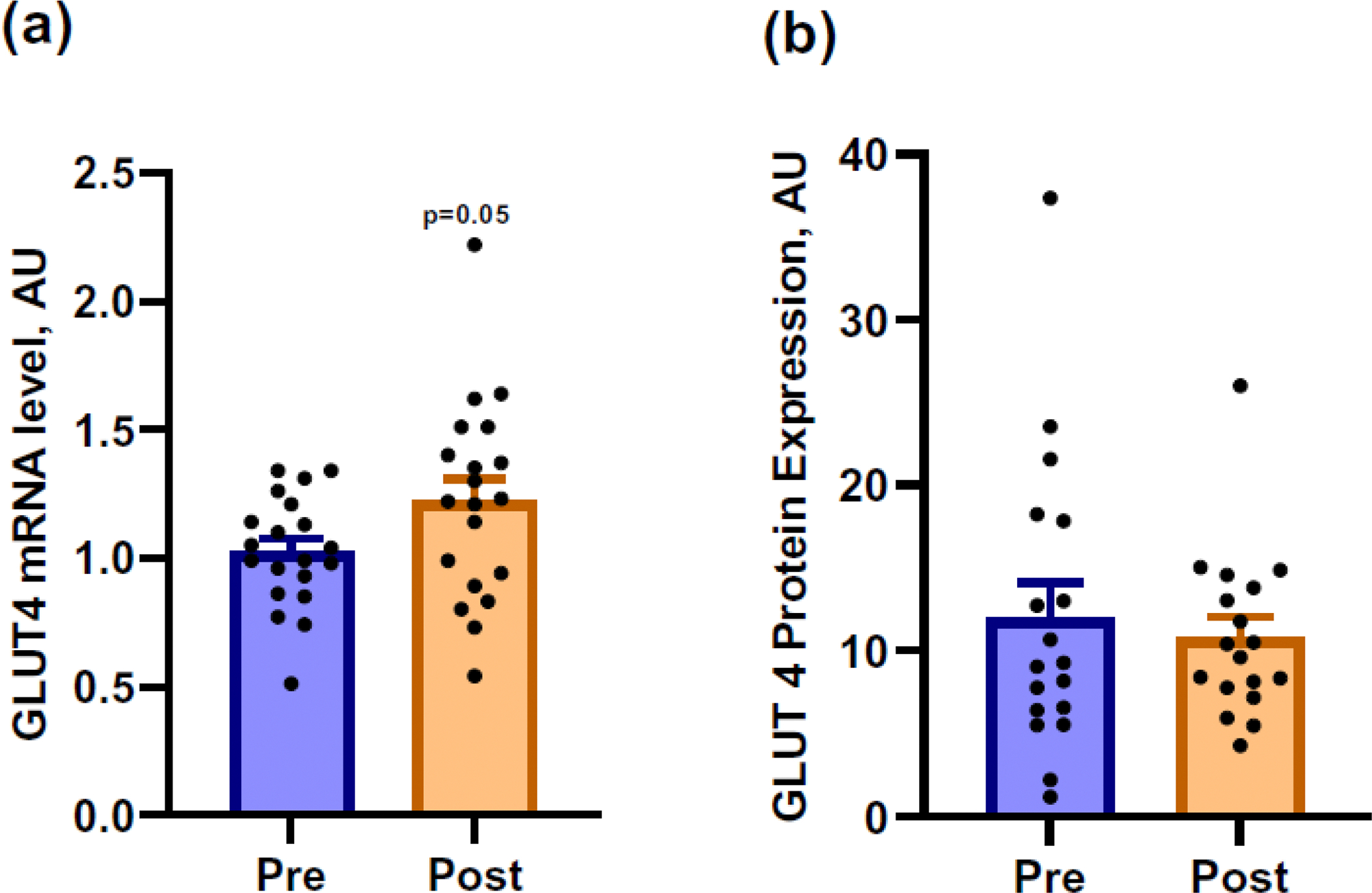 Methods: Twenty healthy men (age 24.0 ± 1.0 years, BMI 23.6 ± 0.4 kg/m2) were recruited for the study. The participants were subjected to an acute bout of exercise on a cycle ergometer at 50% VO2max until they reached a total energy expenditure of 650 kcal. The study was conducted after an overnight fast. Vastus lateralis muscle biopsies were obtained before and immediately after exercise for immunohistochemical analysis to determine lipid, perilipin 3, perilipin 5, and GLUT4 protein contents while GLUT 4 mRNA was quantified using RT-qPCR.