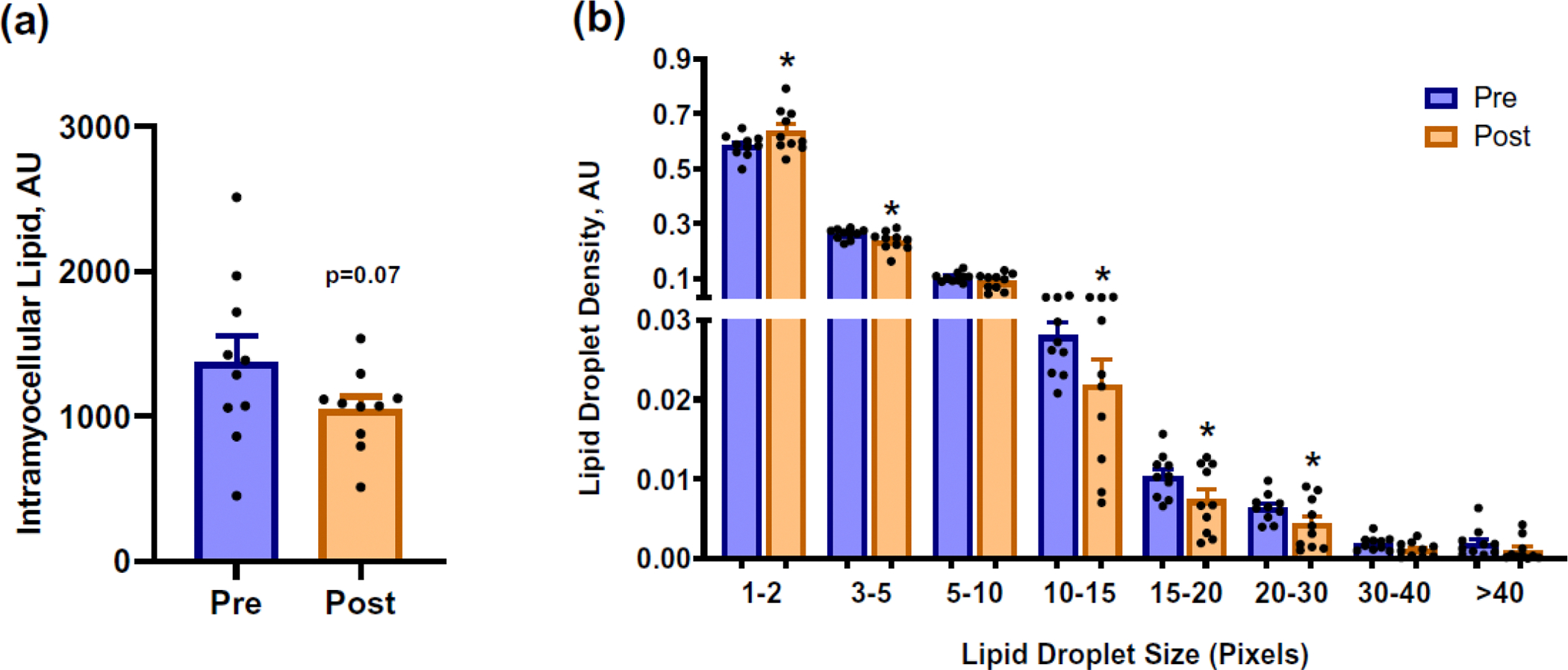 Results: Lipid droplet size decreased whereas total intramyocellular lipid content tended to reduce (p = 0.07) after an acute bout of endurance exercise. The density of smaller lipid droplets in the peripheral sarcoplasmic region significantly increased (0.584 ± 0.04 to 0.638 ± 0.08 AU; p = 0.01) while larger lipid droplets significantly decreased (p < 0.05). GLUT4 mRNA tended to increase (p = 0.05). There were no significant changes in GLUT 4, perilipin 3, and perilipin 5 protein levels.