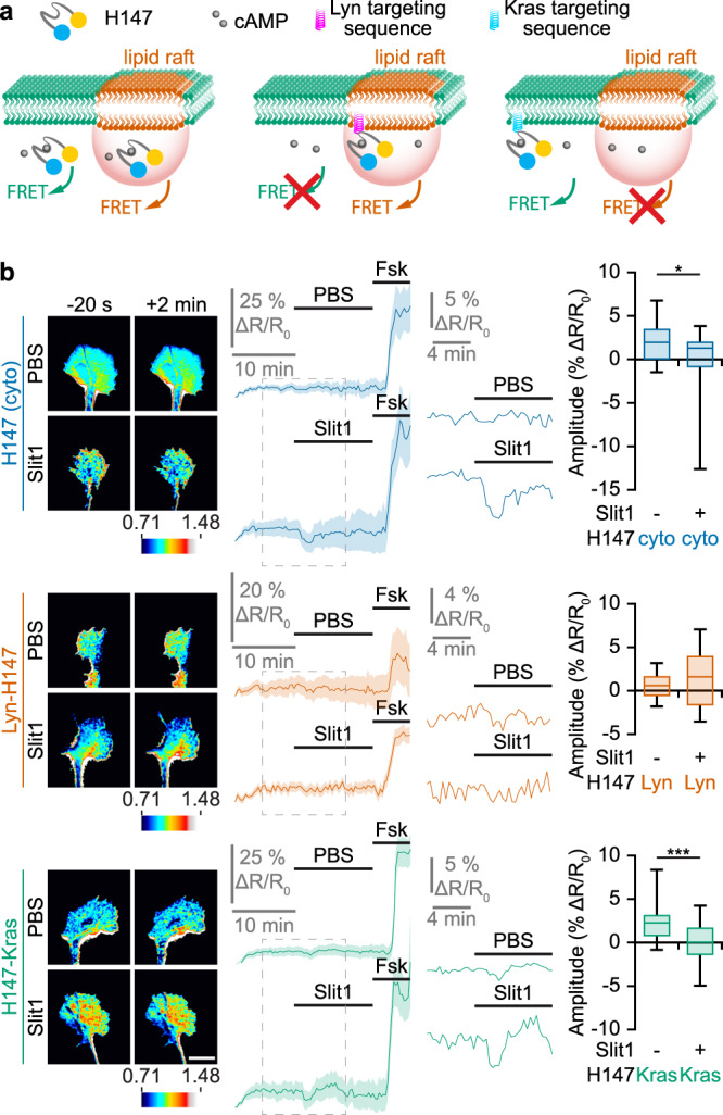 Second messengers, including cAMP, cGMP and Ca2+ are often placed in an integrating position to combine the extracellular cues that orient growing axons in the developing brain. This view suggests that axon repellents share the same set of cellular messenger signals and that axon attractants evoke opposite cAMP, cGMP and Ca2+ changes. Investigating the confinement of these second messengers in cellular nanodomains, we instead demonstrate that two repellent cues, ephrin-A5 and Slit1, induce spatially segregated signals. These guidance molecules activate subcellular-specific second messenger crosstalk, each signaling network controlling distinct axonal morphology changes in vitro and pathfinding decisions in vivo.