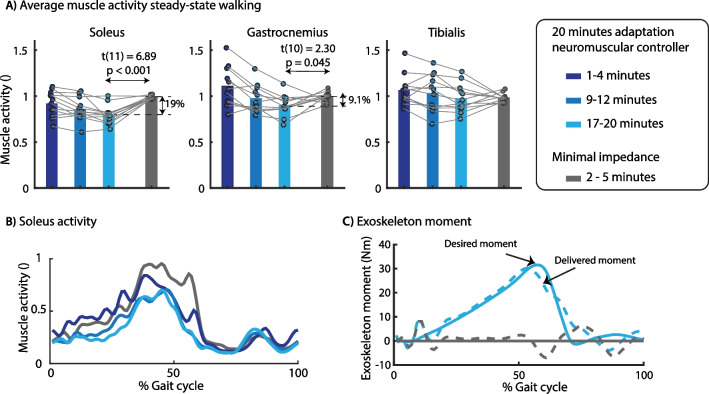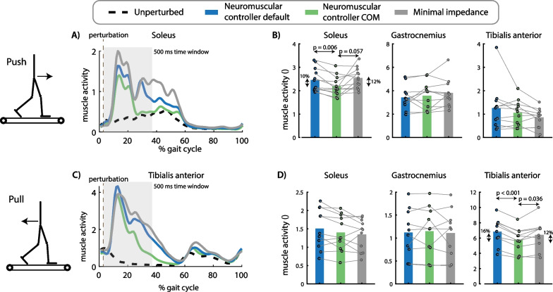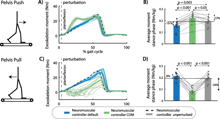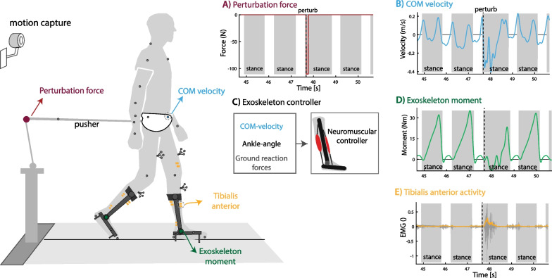 Results: Across twelve subjects, exoskeleton support reduced calf muscle activity in steady-state walking by 19% with respect to a minimal impedance controller (p < 0.001). Proportional feedback of the center of mass velocity improved balance support after perturbation. Muscle activity is reduced in response to push and pull perturbations by 10% (p = 0.006) and 16% (p < 0.001) and center of mass deviations by 9% (p = 0.026) and 18% (p = 0.002) with respect to the same controller without center of mass feedback.