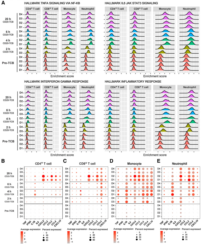 Experimental design: We explored the cellular and molecular players involved in TCB-mediated cytokine release by single-cell RNA-sequencing of whole blood treated with CD20-TCB together with bulk RNA-sequencing of endothelial cells exposed to TCB-induced cytokine release. We used the in vitro whole blood assay and an in vivo DLBCL model in immunocompetent humanized mice to assess the effects of dexamethasone, anti-TNFα, anti-IL6R, anti-IL1R, and inflammasome inhibition, on TCB-mediated cytokine release and antitumor activity.