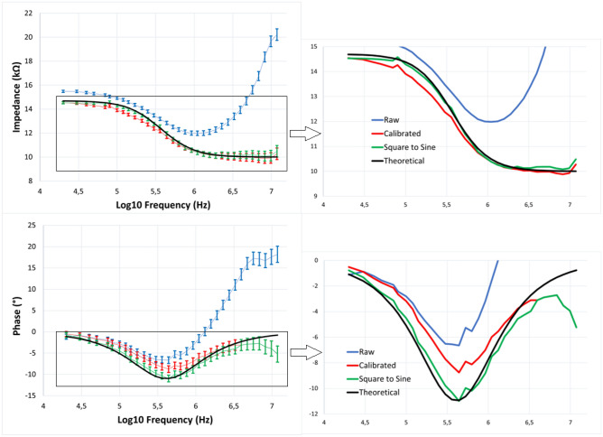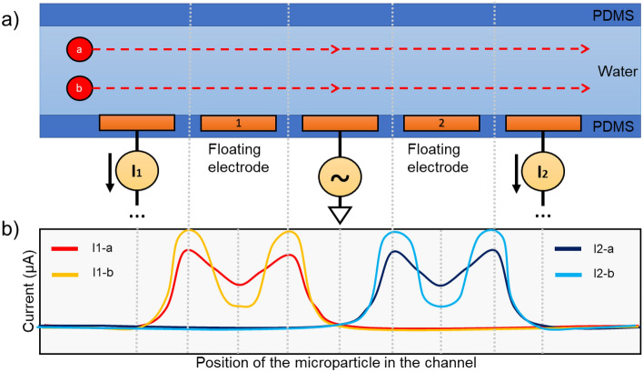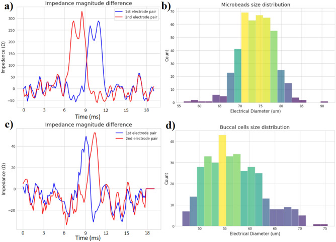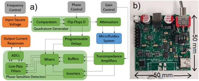 A variety of biosensors have been proposed to quickly detect and measure the properties of individual microorganisms among heterogeneous populations, but challenges related to cost, portability, stability, sensitivity, and power consumption limit their applicability. This study proposes a portable microfluidic device based on impedance flow-cytometry and electrical impedance spectroscopy that can detect and quantify the size of microparticles larger than 45 µm, such as algae and microplastics. The system is low cost ($300), portable (5 cm [Formula: see text] 5 cm), low-power (1.2 W), and easily fabricated utilizing a 3D-printer and industrial printed circuit board technology. The main novelty we demonstrate is the use of square wave excitation signal for impedance measurements with quadrature phase-sensitive detectors. A linked algorithm removes the errors associated to higher order harmonics. After validating the performance of the device for complex impedance models, we used it to detect and differentiate between polyethylene microbeads of sizes between 63 and 83 µm, and buccal cells between 45 and 70 µm. A precision of 3% is reported for the measured impedance and a minimum size of 45 µm is reported for the particle characterization.