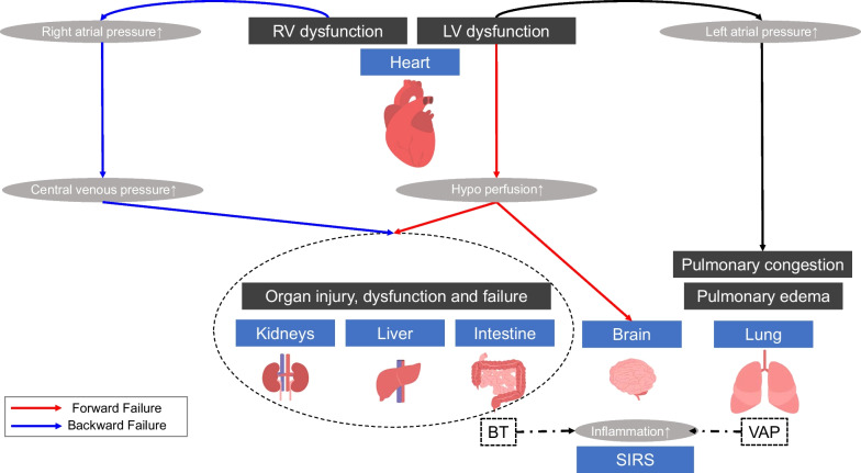 Main body: Although a low cardiac index is a common finding in patients with CS, the ventricular preload, pulmonary capillary wedge pressure, central venous pressure, and systemic vascular resistance might vary between patients. Organ dysfunction has traditionally been attributed to the hypoperfusion of the organ due to either progressive impairment of the cardiac output or intravascular volume depletion secondary to CS. However, research attention has recently shifted from this cardiac output ("forward failure") to venous congestion ("backward failure") as the most important hemodynamic determinant. Both hypoperfusion and/or venous congestion by CS could lead to injury, impairment, and failure of target organs (i.e., heart, lungs, kidney, liver, intestines, brain); these effects are associated with an increased mortality rate. Treatment strategies for the prevention, reduction, and reversal of organ injury are warranted to improve morbidity in these patients. The present review summarizes recent data regarding organ dysfunction, injury, and failure.