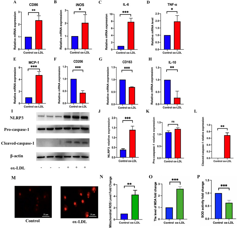Methods: ApoE-/- mice were fed with a high-fat diet supplemented with or without Mdivi-1. RAW264.7 cells were stimulated by ox-LDL, pretreated with or without MCC950, Mito-TEMPO, or Mdivi-1. The burden of plaques and foam cell formation were determined using ORO staining. The blood lipid profles and inflammatory cytokines in serum were detected by commercial kits and ELISA, respectively. The mRNA expression of macrophage polarization markers, activation of NLRP3 and the phosphorylation state of DRP1 were detected. Mitochondrial reactive oxygen species (mito-ROS), mitochondrial staining, ATP level and mitochondrial membrane potential were detected by mito-SOX, MitoTracker, ATP determination kit and JC-1 staining, respectively.