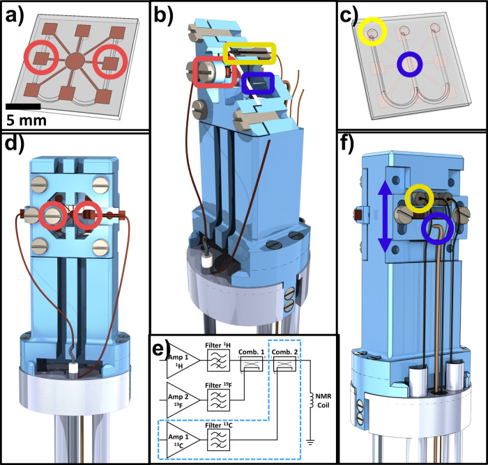 Nuclear Magnetic Resonance (NMR) spectroscopy is a most powerful molecular characterization and quantification technique, yet two major persistent factors limit its more wide-spread applications: poor sensitivity, and intricate complex and expensive hardware required for sophisticated experiments. Here we show NMR with a single planar-spiral microcoil in an untuned circuit with hyperpolarization option and capability to execute complex experiments addressing simultaneously up to three different nuclides. A microfluidic NMR-chip in which the 25 nL detection volume can be efficiently illuminated with laser-diode light enhances the sensitivity by orders of magnitude via photochemically induced dynamic nuclear polarization (photo-CIDNP), allowing rapid detection of samples in the lower picomole range (normalized limit of detection at 600 MHz, nLODf,600, of 0.01 nmol Hz1/2). The chip is equipped with a single planar microcoil operating in an untuned circuit that allows different Larmor frequencies to be addressed simultaneously, permitting advanced hetero-, di- and trinuclear, 1D and 2D NMR experiments. Here we show NMR chips with photo-CIDNP and broadband capabilities addressing two of the major limiting factors of NMR, by enhancing sensitivity as well as reducing cost and hardware complexity; the performance is compared to state-of-the-art instruments.