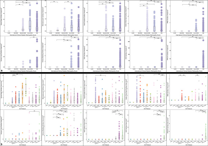 Methods: In this study, we collected UWF images from adult patients with diabetes. Poor-quality images and eyes with any pathology precluding assessment of DR severity were excluded. The DR lesions were manually segmented. DR severity was graded according to the International Clinical Diabetic Retinopathy (ICDR) and AA protocol by two masked graders within the ETDRS S7F. These lesions' numbers and surface area were computed and correlated against the DR scores using the Kruskal-Wallis H test. Cohen's Kappa was performed to determine the agreement between two graders.