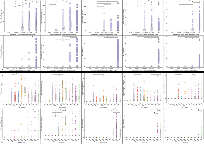 Conclusion: A quantitative approach reveals that DR lesions' number and area generally correlate with ICDR-based categorical DR severity levels with an increasing trend in the number and area of DR lesions from mild to severe NPDR and a decrease from severe NPDR to PDR.