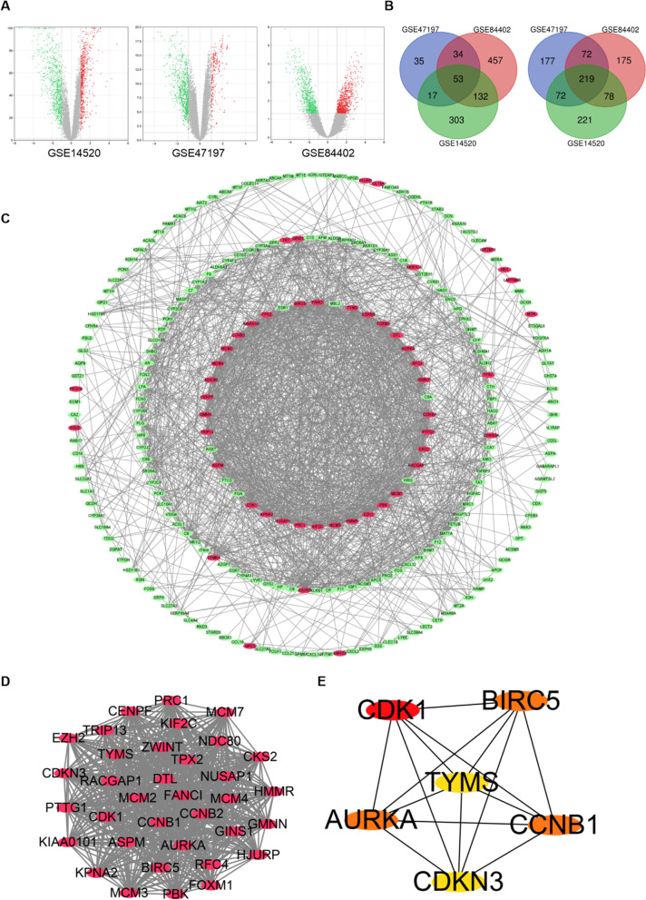 Conclusion: In conclusion, AURKA, BIRC5, CCNB1, CDK1, CDKN3 and TYMS could be potential targets for the diagnosis and prognosis of HBV-related HCC. Clinical drugs include chemotherapeutic and targeted drug, traditional Chinese medicine is mainly bitter and warm TCM. Small molecular of TCM including flavonoids, terpenoids and glycosides and alkaloids, which have great potential in anti-HBV-related HCC. This study provides potential therapeutic targets and novel strategies for the treatment of HBV-related HCC.