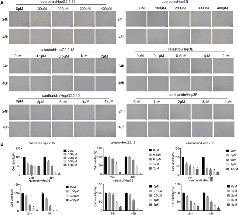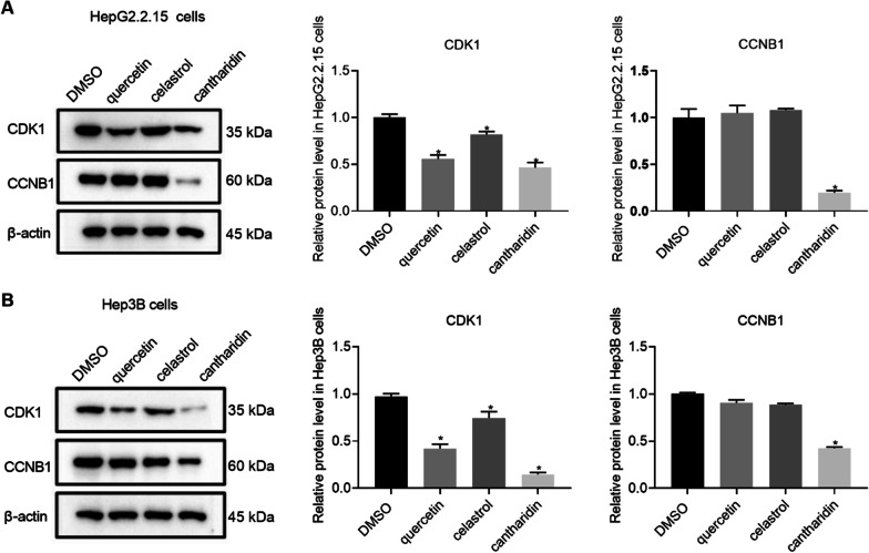 Methods: In this study, three microarray datasets totally containing 330 tumoral samples and 297 normal samples were selected from the GEO database. These microarray datasets were used to screen DEGs. And the expression profile and survival of 6 key genes were analyzed. In addition, Comparative Toxicogenomics Database and Coremine Medical database were used to enrich clinical drugs and TCM of HBV-related HCC by the 6 key targets. Then the obtained TCM were classified based on the Chinese Pharmacopoeia. Among these top 6 key genes, CDK1 and CCNB1 had the most connection nodes and the highest degree and were the most significantly expressed. In general, CDK1 and CCNB1 tend to form a complex, which is conducive to cell mitosis. Hence, this study mainly studied CDK1 and CCNB1. HERB database was used to predict small molecules TCM. The inhibition effect of quercetin, celastrol and cantharidin on HepG2.2.15 cells and Hep3B cells was verified by CCK8 experiment. The effects of quercetin, celastrol and cantharidin on CDK1 and CCNB1 of HepG2.2.15 cells and Hep3B cells were determined by Western Blot.