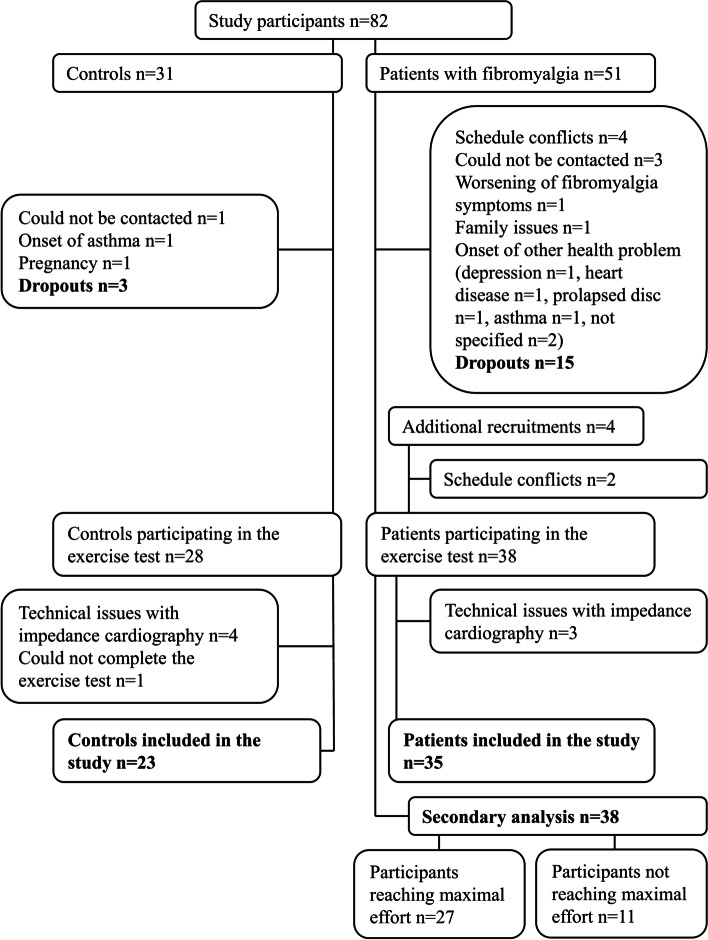 Methods: Thirty-five women with FM, aged 23 to 65 years, and 23 healthy controls performed a step incremental cycle ergometer test until volitional fatigue. Alveolar gas exchange and pulmonary ventilation were measured breath-by-breath and adjusted for fat-free body mass (FFM) where appropriate. [Formula: see text] (impedance cardiography) was monitored. [Formula: see text] was calculated using Fick's equation. Linear regression slopes for oxygen cost (∆[Formula: see text]O2/∆work rate) and [Formula: see text] to [Formula: see text]O2 (∆[Formula: see text]/∆[Formula: see text]O2) were calculated. Normally distributed data were reported as mean ± SD and non-normal data as median [interquartile range].