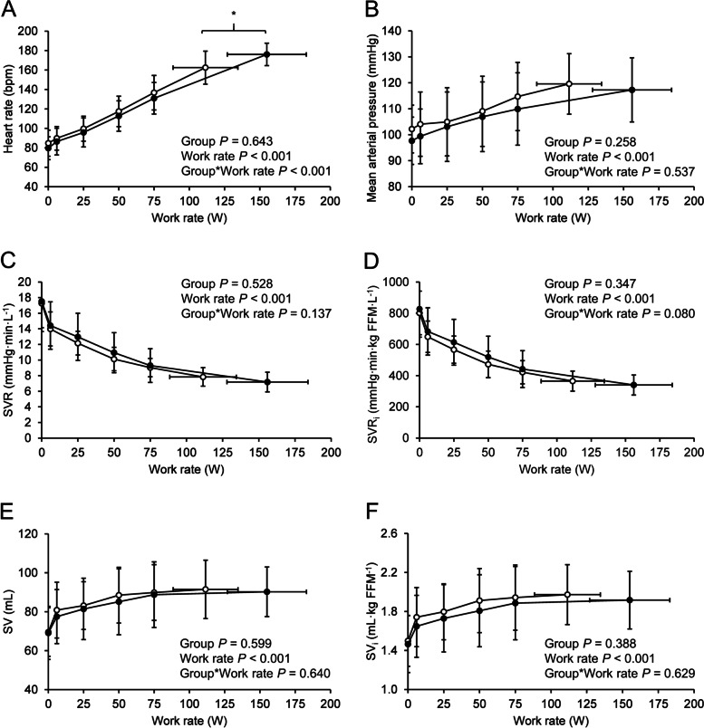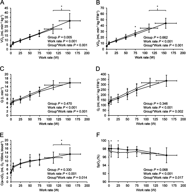 Results: [Formula: see text]O2peak was lower in FM patients than in controls (22.2 ± 5.1 vs. 31.1 ± 7.9 mL∙min-1∙kg-1, P < 0.001; 35.7 ± 7.1 vs. 44.0 ± 8.6 mL∙min-1∙kg FFM-1, P < 0.001). [Formula: see text] and C(a-v)O2 were similar between groups at submaximal work rates, but peak [Formula: see text] (14.17 [13.34-16.03] vs. 16.06 [15.24-16.99] L∙min-1, P = 0.005) and C(a-v)O2 (11.6 ± 2.7 vs. 13.3 ± 3.1 mL O2∙100 mL blood-1, P = 0.031) were lower in the FM group. No significant group differences emerged in ∆[Formula: see text]O2/∆work rate (11.1 vs. 10.8 mL∙min-1∙W-1, P = 0.248) or ∆[Formula: see text]/∆[Formula: see text]O2 (6.58 vs. 5.75, P = 0.122) slopes.