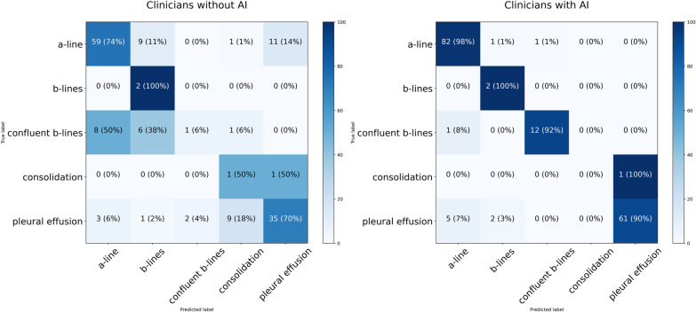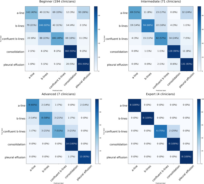 Results: The average accuracy of beginners' LUS interpretation was 68.7% [95% CI 66.8-70.7%] compared to 72.2% [95% CI 70.0-75.6%] in intermediate, and 73.4% [95% CI 62.2-87.8%] in advanced users. Experts had an average accuracy of 95.0% [95% CI 88.2-100.0%], which was significantly better than beginners, intermediate and advanced users (p < 0.001). When supported by our AI tool for interpreting retrospectively acquired clips, the non-expert clinicians improved their performance from an average of 68.9% [95% CI 65.6-73.9%] to 82.9% [95% CI 79.1-86.7%], (p < 0.001). In prospective real-time testing, non-expert clinicians improved their baseline performance from 68.1% [95% CI 57.9-78.2%] to 93.4% [95% CI 89.0-97.8%], (p < 0.001) when using our AI tool. The time-to-interpret clips improved from a median of 12.1 s (IQR 8.5-20.6) to 5.0 s (IQR 3.5-8.8), (p < 0.001) and clinicians' median confidence level improved from 3 out of 4 to 4 out of 4 when using our AI tool.